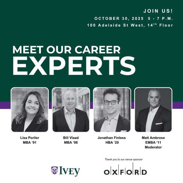 Join fellow Ivey Business School Alumni for an evening of networking, insights, and actionable advice at all career stages. Whether you’re looking to accelerate your current path or considering a transition, this event will give you practical strategies and the opportunity to reconnect with the strength of the Ivey network. The expert all-Ivey Alumni panel features: