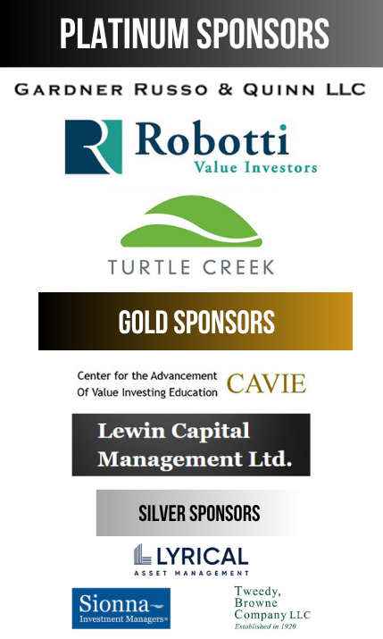 We would like to thank our donors for their generous support. Platinum Donors: Gardner Russo & Quinn LLC, Robotti & Company Advisors, and Turtle Creek Asset Management Inc.. Gold Donors: The Center for the Advancement of Value Investing Education, and Lewin Capital Management Ltd. Silver Donors: Lyrical Asset Management, Sionna Investment Managers, and Tweedy, Browne Company LLC.