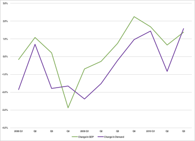Second, Ontario provincial data is available on a quarterly basis, permitting a retrospective analysis of the ‘GDP-electricity demand’ relationship. The figure below illustrates the close relationship between changes in GDP and (normalized) electricity demand during the 2008-2010 period.