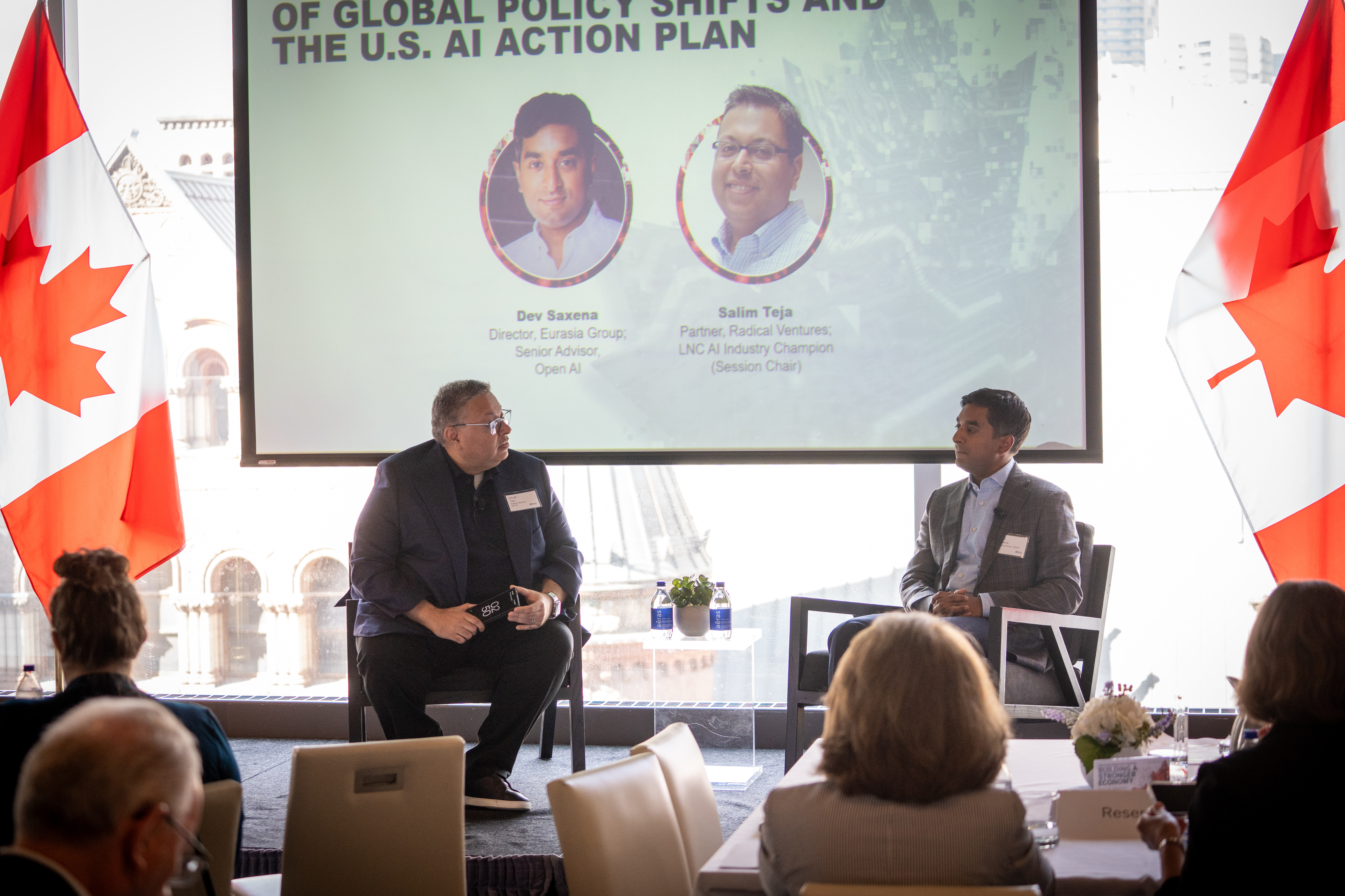 Across two interconnected discussions, the symposium examined how Canada can align its infrastructure, talent, and policy systems to remain competitive. Salim Teja of Radical Ventures and Dev Saxena of Eurasia Group and OpenAI explored the United States’ newly launched AI Action Plan and its global implications, while Schaan later joined Kara Beckles, Chief Data Officer at the Treasury Board Secretariat, for a fireside conversation on the federal government’s role in strengthening AI infrastructure and adoption. The discussion was moderated by Mahmood Nanji, LNC’s Power Corporation of Canada Policy Fellow.